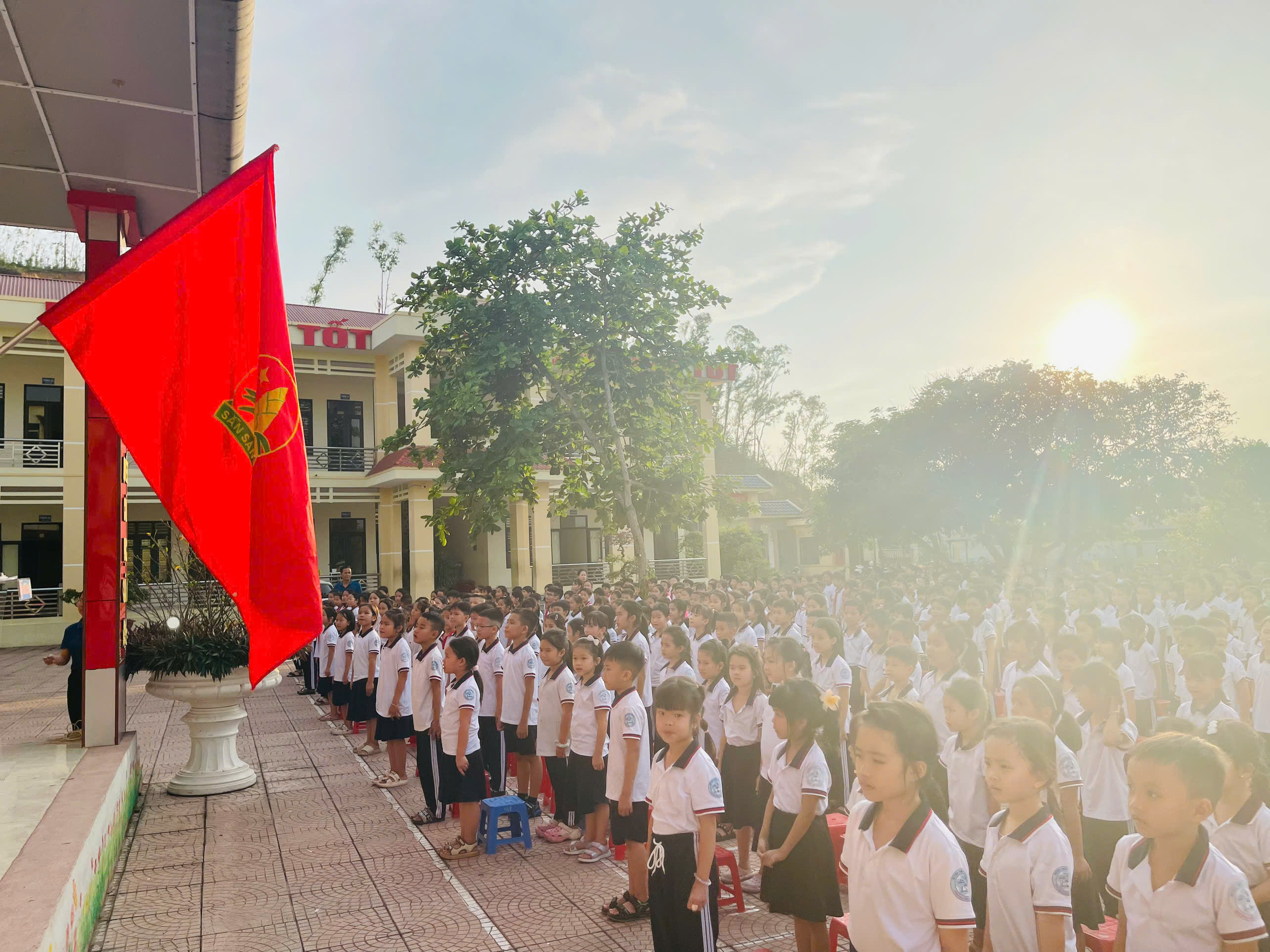 Cùng với nghi lễ chào cờ Đội, các em học sinh được nghe cô TPT tuyên